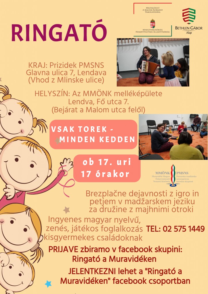Az idei évben is folytatódik a Ringató, és pedig január14-től, keddtől Lendván, az MMÖNK melléképületében (bejárat a Malom utca felől). A zenés, játékos foglalkozás a 0–4 éves gyermekek számára a legalkalmasabb. Minden érdeklődőt szívesen várunk!