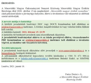 2020 a nemzeti összetartozás és az erős magyar közösségek éve, ezért a Muravidéki Magyar Értéktár Bizottság pályázatot hirdet a Muravidéki Magyar Értéktár bővítésére tanulók és diákok javaslatai alapján, amelyeket 2021-ben az eddig felvett értékekkel együtt kiadványban jelentet meg.