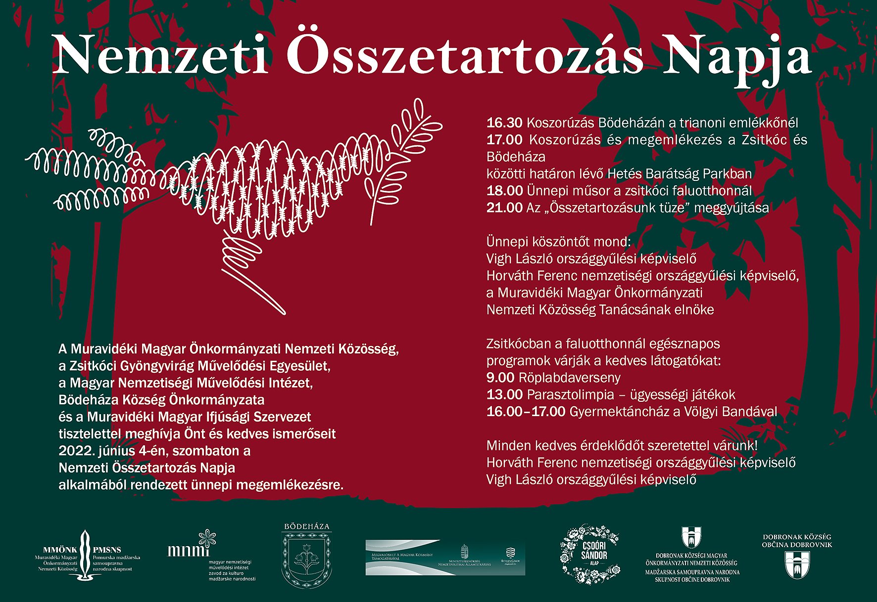 Június 4-e a nemzeti összetartozás napja, a trianoni békeszerződés aláírásának évfordulójára emlékező nemzeti emléknap. Ez alkalomból szombaton, 2022. június 4-én egésznapos program várja az érdeklődőket különböző helyszíneken.