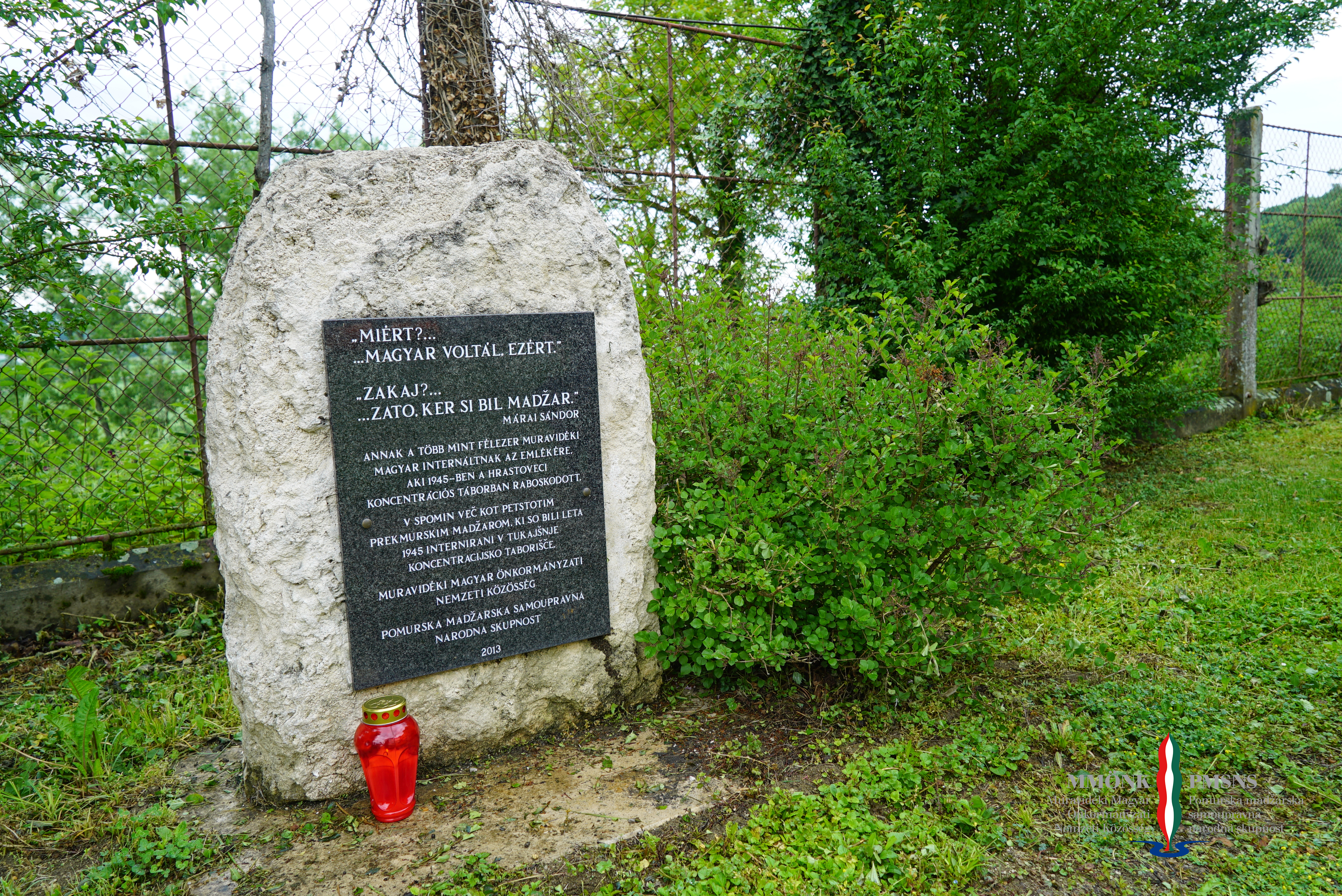 V spomin več kot petstotim prekmurskim Madžarom, ki so bili leta 1945 internirani v koncentracijsko taborišče Hrastovec, je leta 2013 Pomurska madžarska samoupravna narodna skupnost na dvorišču za gradom Hrastovec postavila spominsko tablo. Preživeli in njihovi svojci so izrazili željo po premestitvi spomenika na vidnejšo lokacijo pred sam grad, zato so udeleženci današnjega srečanja: dr. Magdalena Šverc, svetovalka ministra za delo, družino, socialne zadeve in enake možnosti, Ferenc Horváth, poslanec in predsednik Sveta PMSNS, Zsuzsanna Bači, podpredsednica Sveta PMSNS, mag. Janez Kramberger, župan Občine Lenart, mag. Andreja Raduha, direktorica Socialno varstvenega zavoda Hrastovec in predstavnika Zavoda za varstvo kulturne dediščine, razpravljali o tej zadevi in po terenskem ogledu našli primerno lokacijo za premestitev spomenika na zelenico pred gradom.